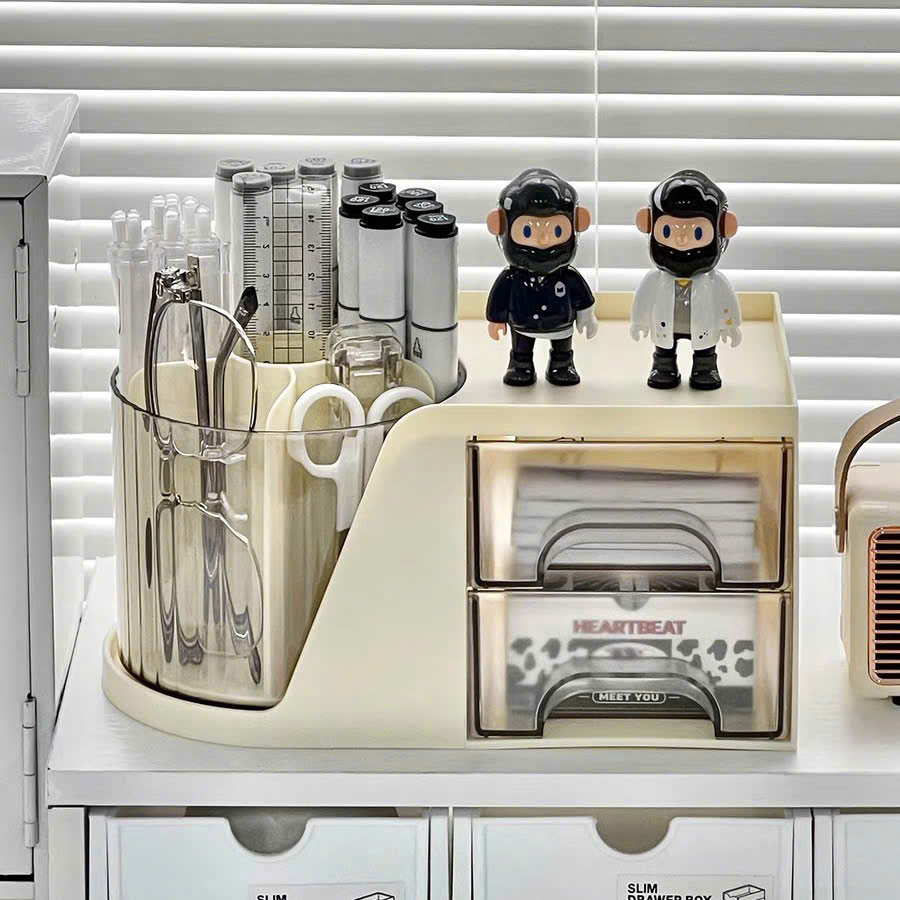 Kệ bút, mỹ phẩm để bàn – kèm ống xoay 360°, ngăn kéo