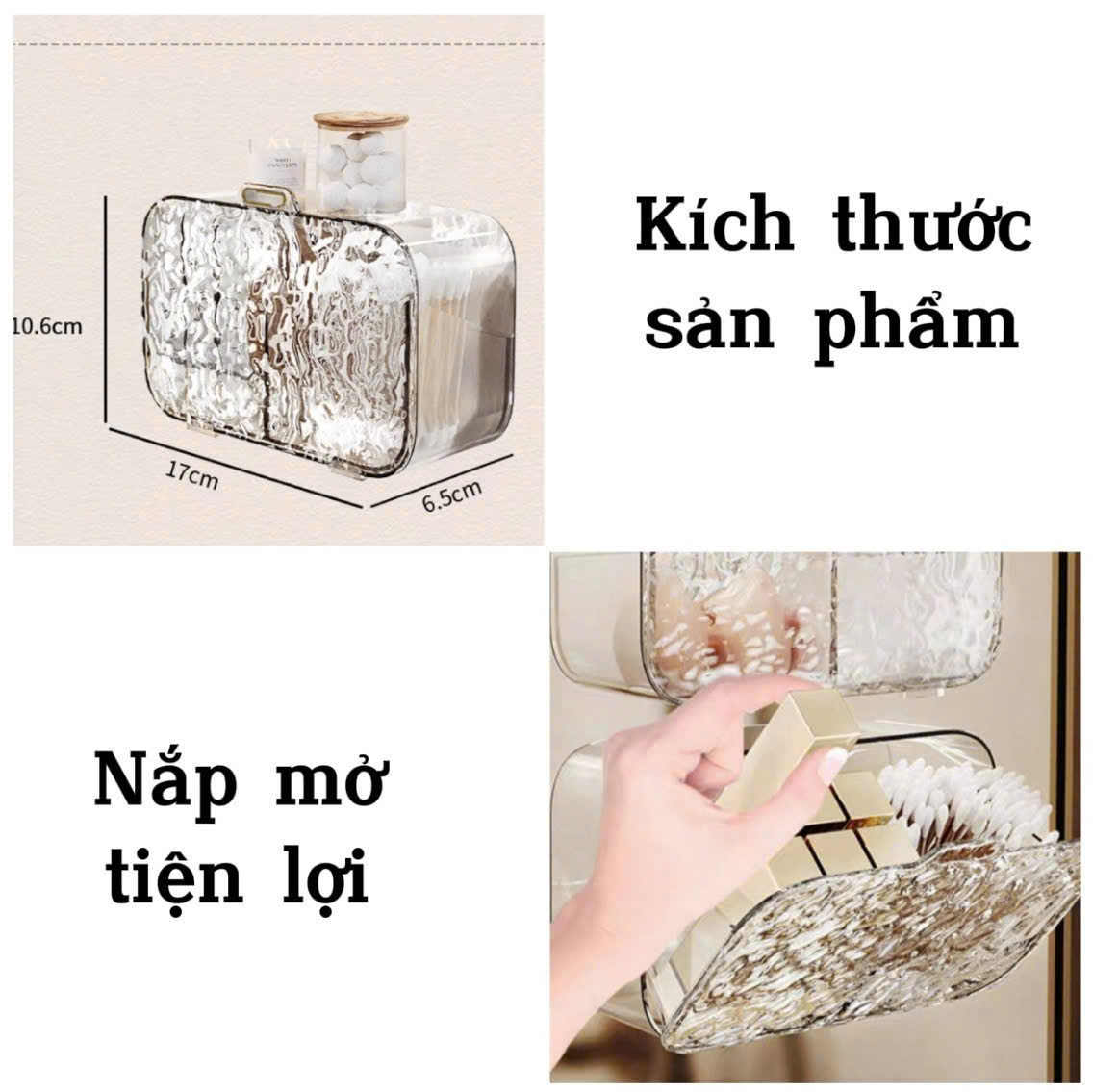 - Thiết kế: 2 ngăn đa năng – đựng bông tẩy trang, tăm bông và đồ làm đẹp khác